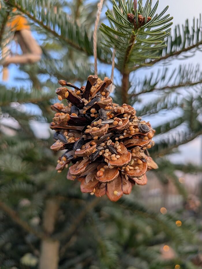 Auch an die vielen Vögel, die jetzt im Winter auf Futtersuche sind, wurde gedacht: in Fett getauchte Kiefernzapfen in Wintervogelfutter gewälzt ergibt wunderschönen Christbaumschmuck, der gleichzeitig Nahrung für Meise, Kleiber, Spatz, Amsel und andere Vögel dient.